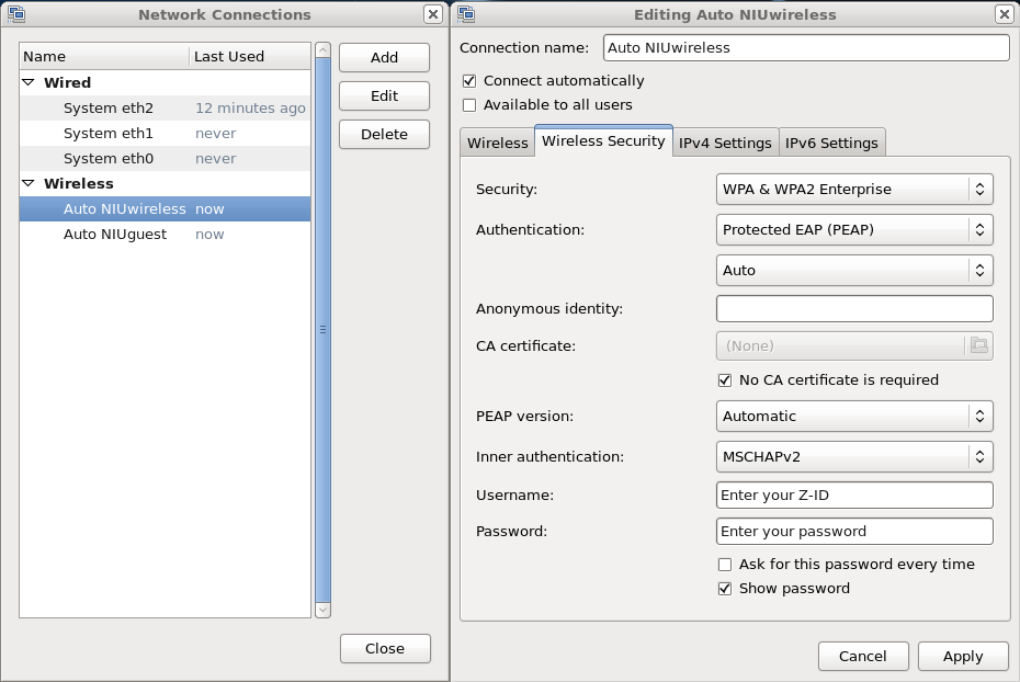 Only protected NIUwireless network (ZID/password) or wired desktops can be used for connections. Cluster is not accessible from the public wireless "NIUguest" network. Connection instructions:
